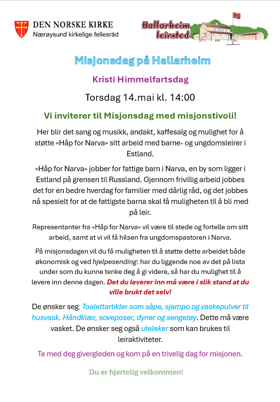 Misjonsdag på Hallarheim med misjonstivoli. Sang og musikk, andakt, kaffesalg og mulighet for å støtte «Håp for Narva». Se plakat for mer info.
